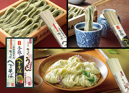小嶋屋総本店伝承の「フノリ(海藻)つなぎ」乾麺3種が一度に楽しめる、オンラインショップ限定・特別なお得セットです。