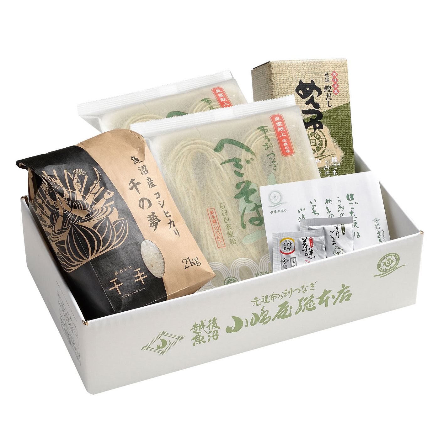 人気の生へぎそば(4人前)に魚沼産コシヒカリを加えた贅沢なセットです。