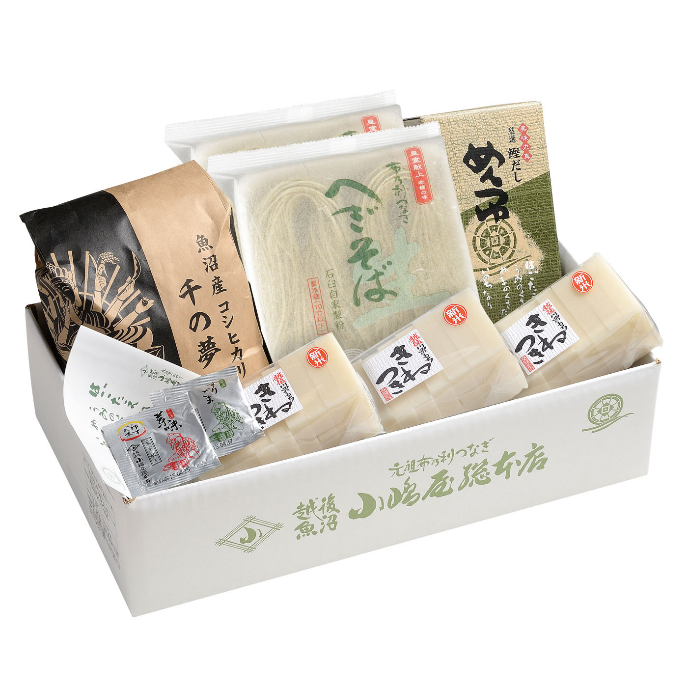 人気の生へぎそば(4人前)に魚沼産コシヒカリときねつきこがねもち100%の切りもちを加えた贅沢なセットです。